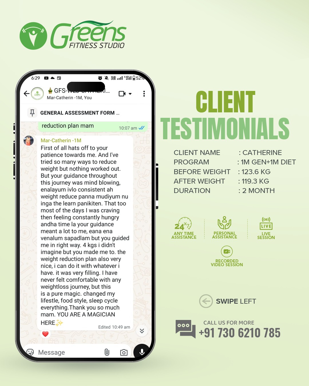 In the heart of Perinthalmanna, Greens Fitness Solution has long been an emblem of excellence in conventional fitness training. We've stepped into the digital sphere with Greens Fitness Studio, an online training program that delivers the essence of fitness straight to your doorstep, drawing on our years of rich expertise. Our team, comprising seasoned fitness trainers and dedicated dieticians, boasts over a decade of expertise in the domain. We're not just trainers; we're alongside you in the journey to a healthier lifestyle.