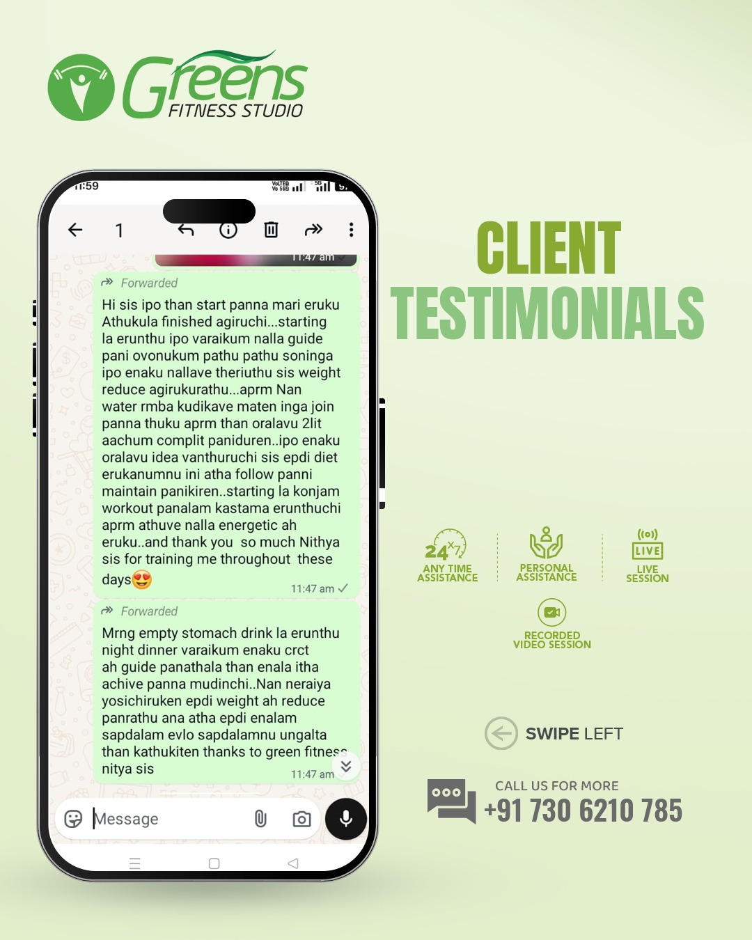 Embracing health is not about conforming to stereotypes; it's about nurturing your body for a resilient soul. At Greens Fitness Studio, we craft personalized journeys for all body types. Our mission is clear: to help you achieve vitality through a balanced lifestyle and a nourishing diet. With programs tailored for weight loss, weight gain, PCOD/PCOS, thyroid health, and expert dietician consultations, we ensure that you don't just exist but thrive. Your well-being is not about being skinny; it's about igniting your metabolism and boosting immunity. Experience a profound transformation with Greens Fitness Studio.